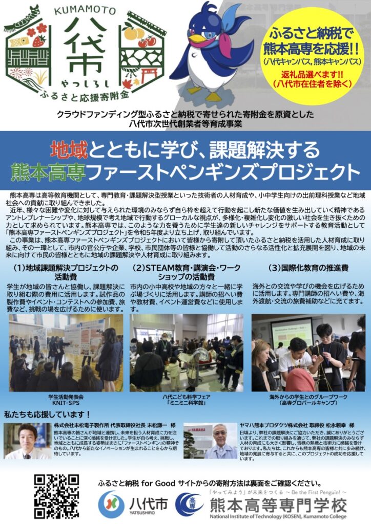【八代市広報】熊本高専「ファーストペンギンズプロジェクト」が学生の挑戦を支援するクラウドファンディングを開始