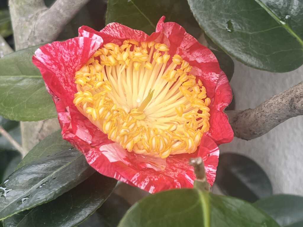 肥後椿は、江戸時代に肥後藩で門外不出の花とされた椿で花弁が平開して一重咲きで、雄蕊が大きく華やかなのが特徴です。