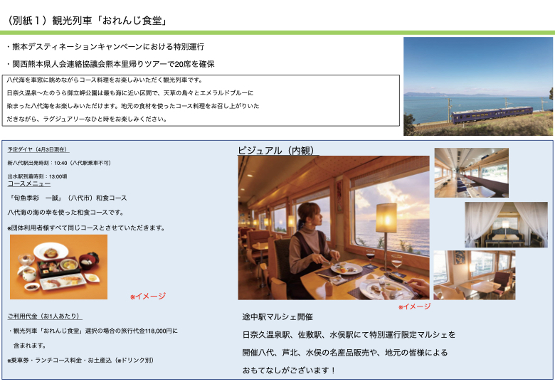 - 観光列車「おれんじ食堂」乗車: 八代海の絶景を眺めながら、地元の海の幸を使った和食コースをご堪能ください(20席限定) 。